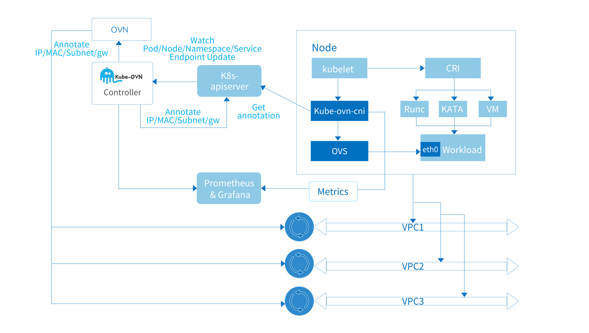 Kube-OVN also maintains a good openness to integrate with many technology solutions, such as Cilium, Submariner, Prometheus, KubeVirt, etc.