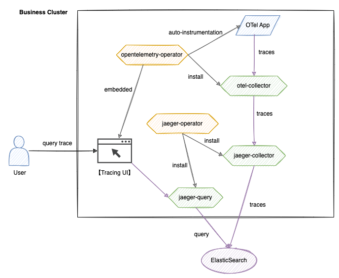 Application -> otel-collector -> jaeger-collector -> ElasticsearchThe application generates Span data via SDK or automatic injection, which is standardized by the otel-collector and subsequently persisted to Elasticsearch by the jaeger-collector.